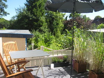 Die Morgensonne lädt zum Frühstücken auf der kleinen Terrasse hinter dem Haus ein. Die Ruhe kann man dort den ganzen Tag genießen.