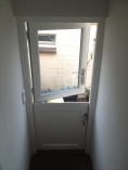 Endlich ist die häßliche Tür zum Garten weg. Nun haben wir eine schöne Holztür - im Klönschnack-Style: Es kann die obere Hälfte geöffnet werden.